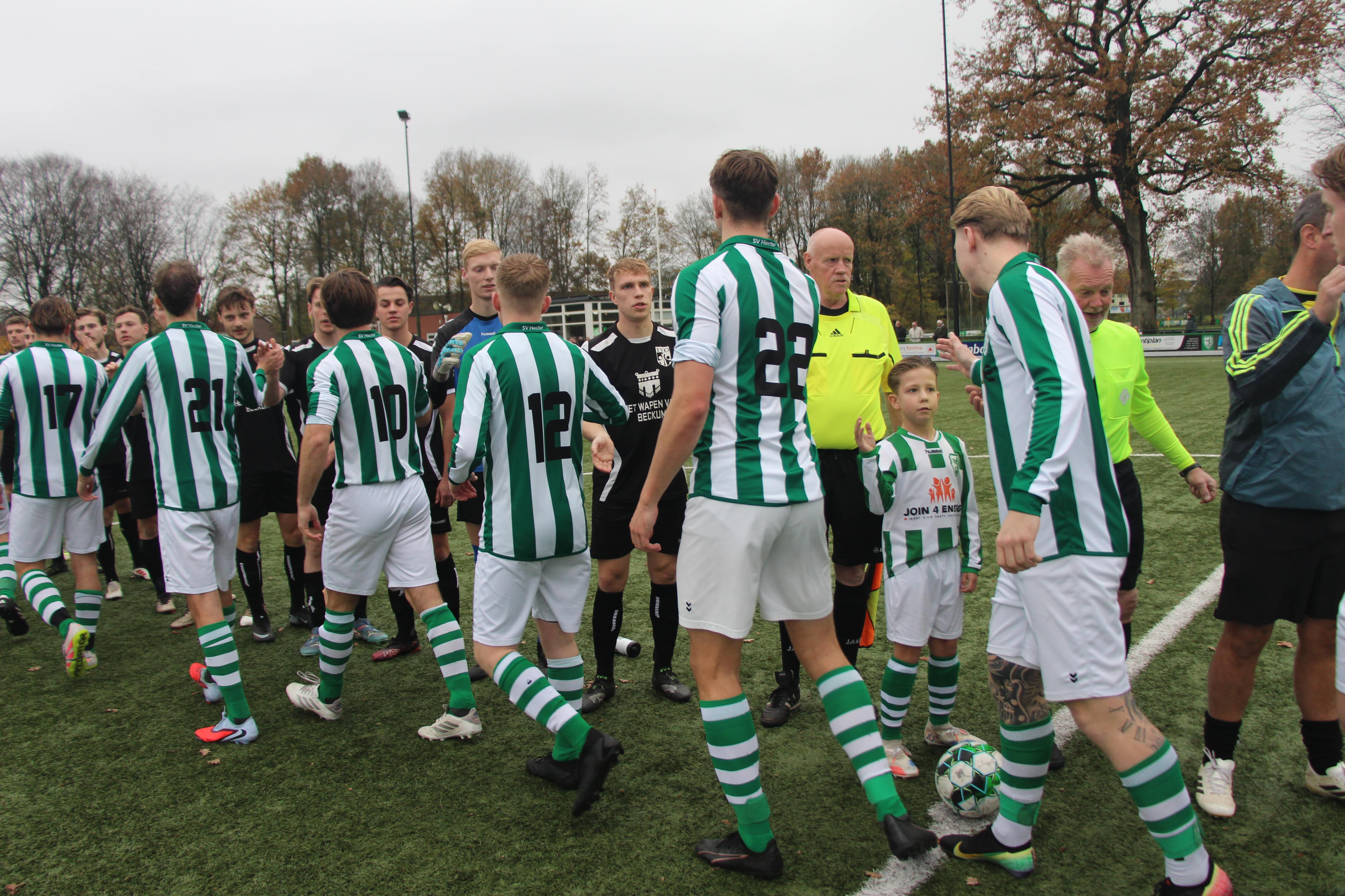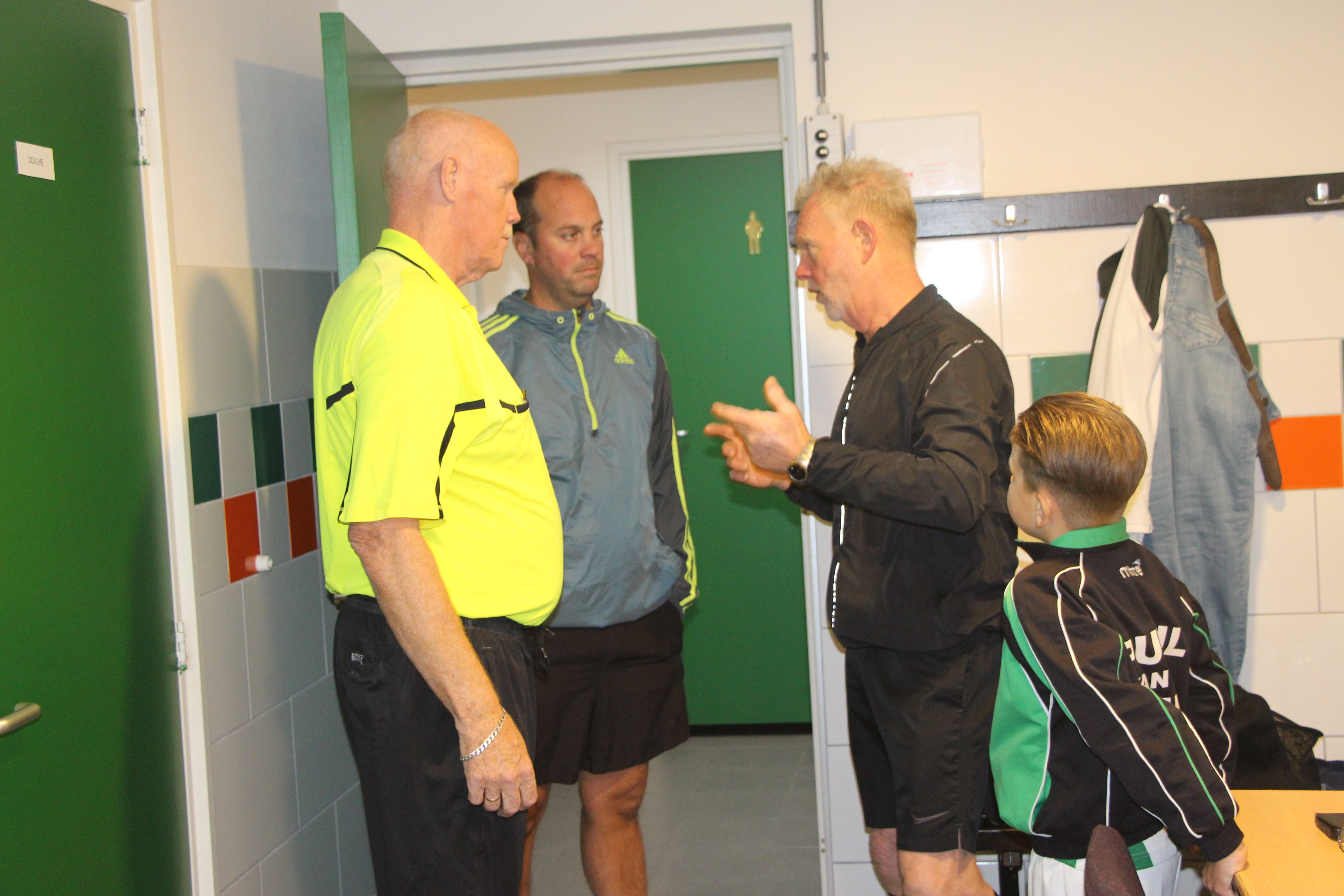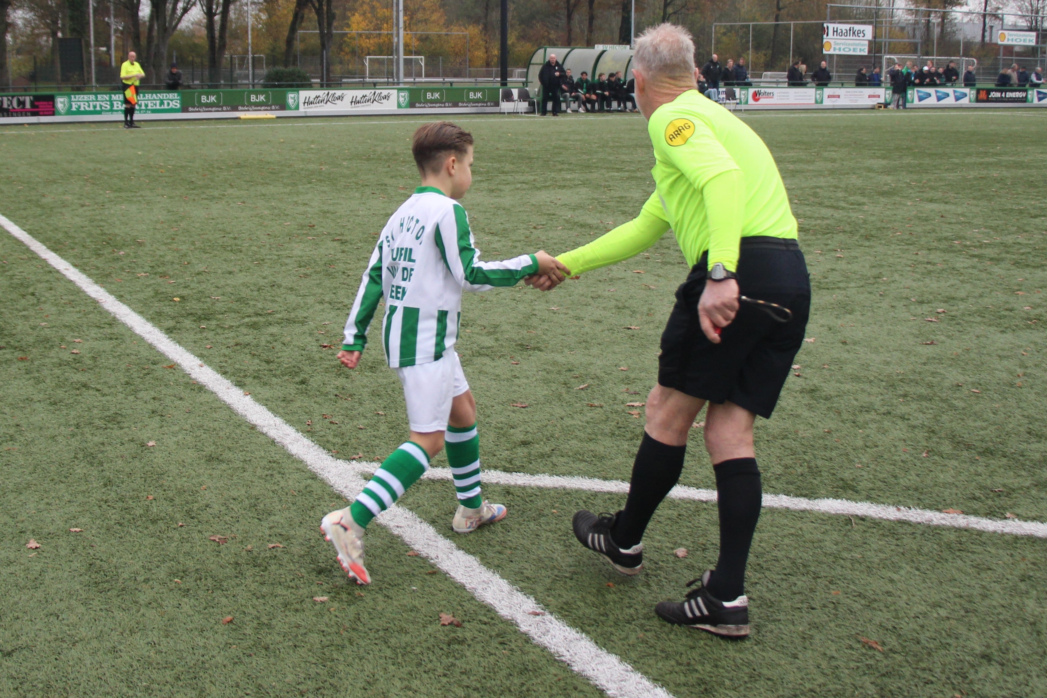 Met de scheids mee naar de kleedkamers voor de spelerscontrole en vervolgens de opkomst van de beide teams.
