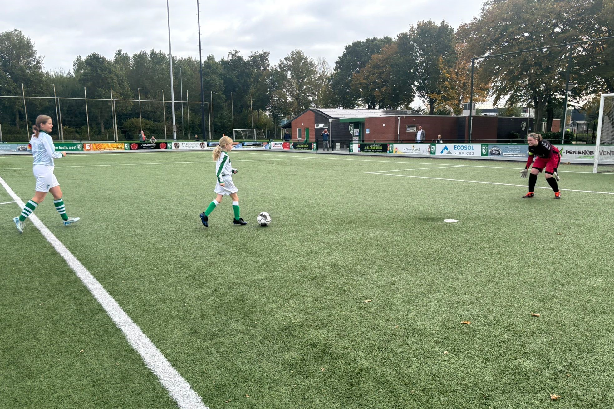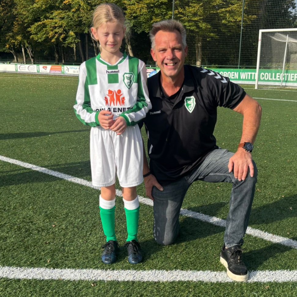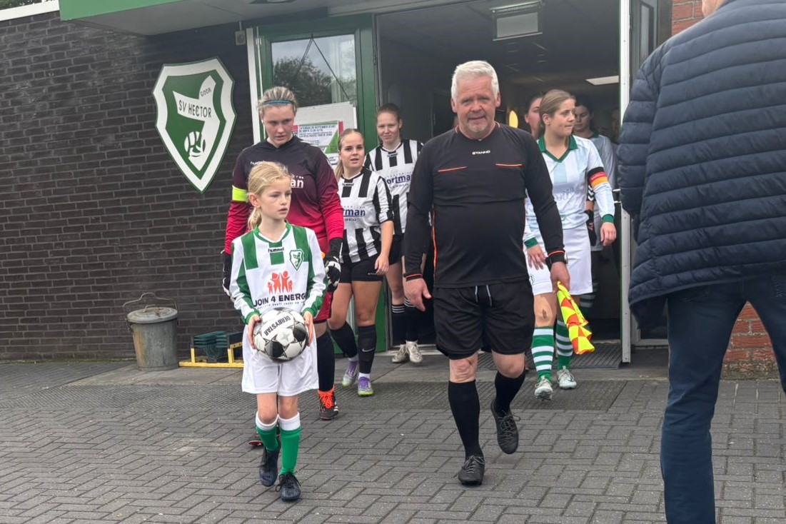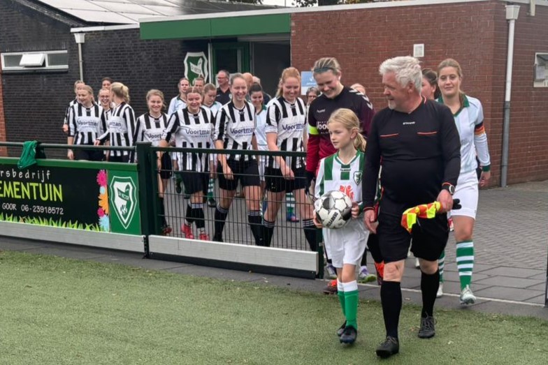 Met de scheidsrechter was afgesproken dat Suus het muntje mocht opgooien bij de toss. En daarna kwam het fluitsignaal, Suus mocht aftrappen en proberen te scoren. Ze nam de bal mooi mee aan de voet. Zelfs de tegenstanders zeiden dit. En met een mooi schot zo tussen de benen door van de keeper zat de bal erin!