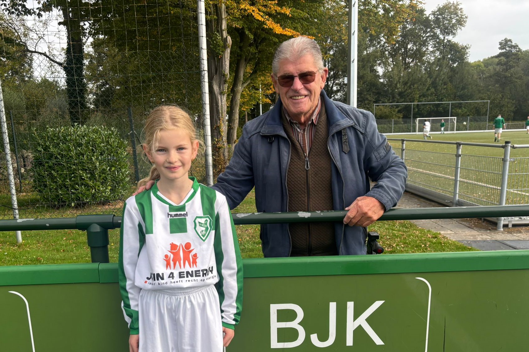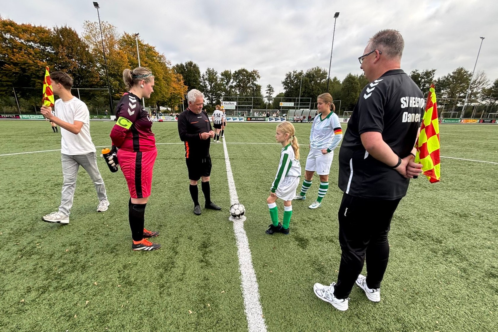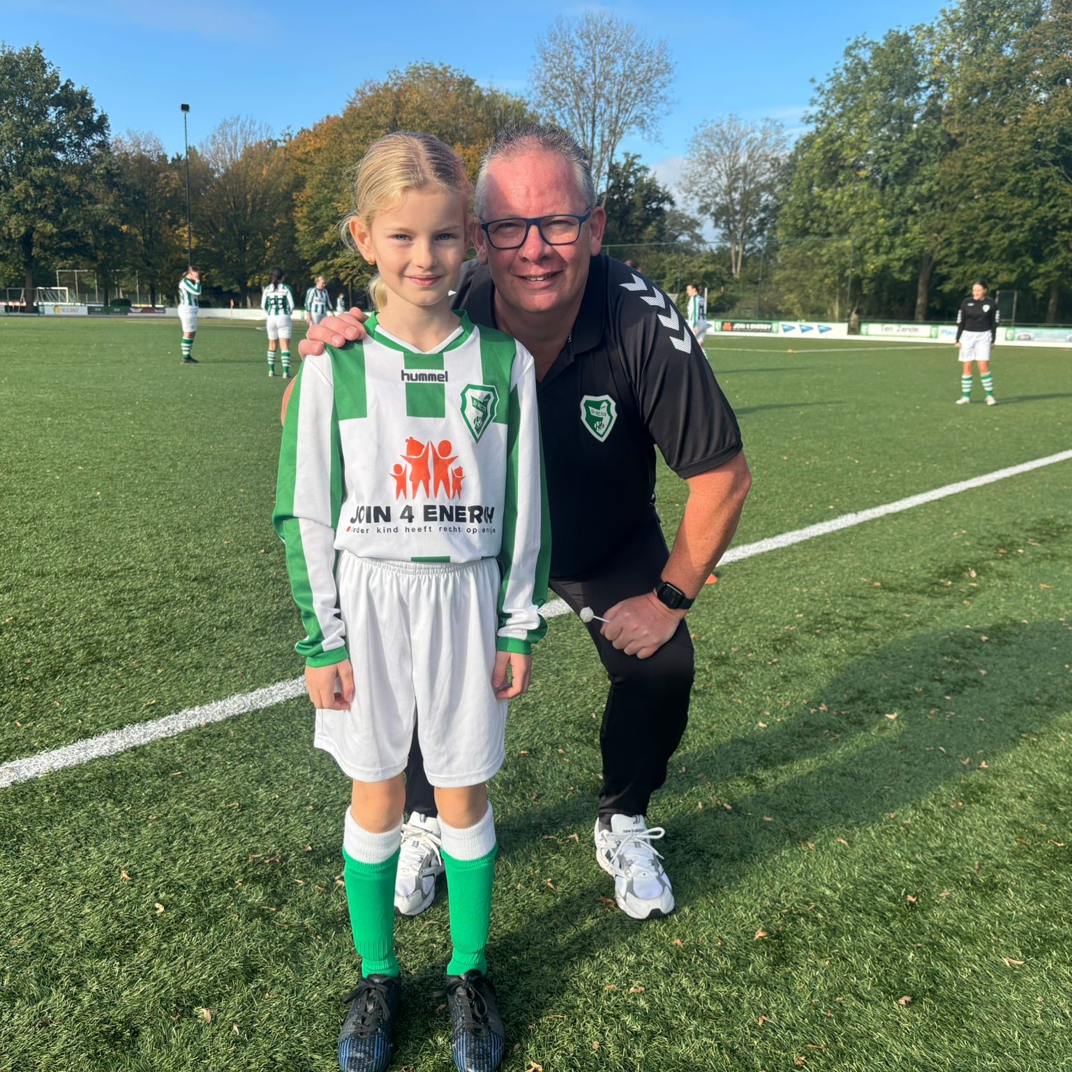 Met de scheidsrechter was afgesproken dat Suus het muntje mocht opgooien bij de toss. En daarna kwam het fluitsignaal, Suus mocht aftrappen en proberen te scoren. Ze nam de bal mooi mee aan de voet. Zelfs de tegenstanders zeiden dit. En met een mooi schot zo tussen de benen door van de keeper zat de bal erin!