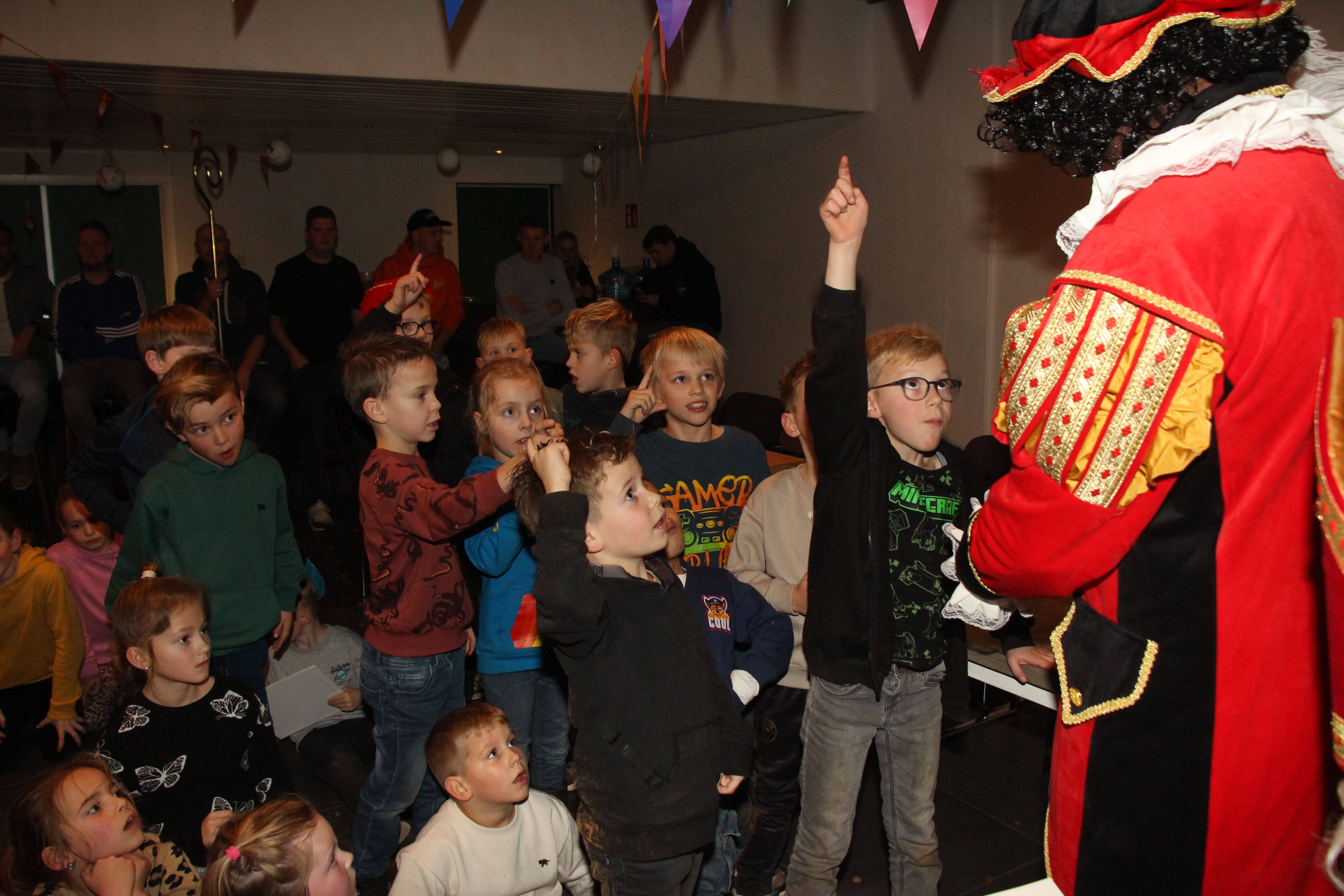 De spelertjes vanaf de welpen t/m JO9 waren in opperste staat van opwinding toen Sint met zijn Pieten binnenkwam. Maar wat zij niet hadden gezien was dat Sint en zijn gevolg eerst nog even de eetgroep van de Wijkvoorziening in de kantine had toegesproken.