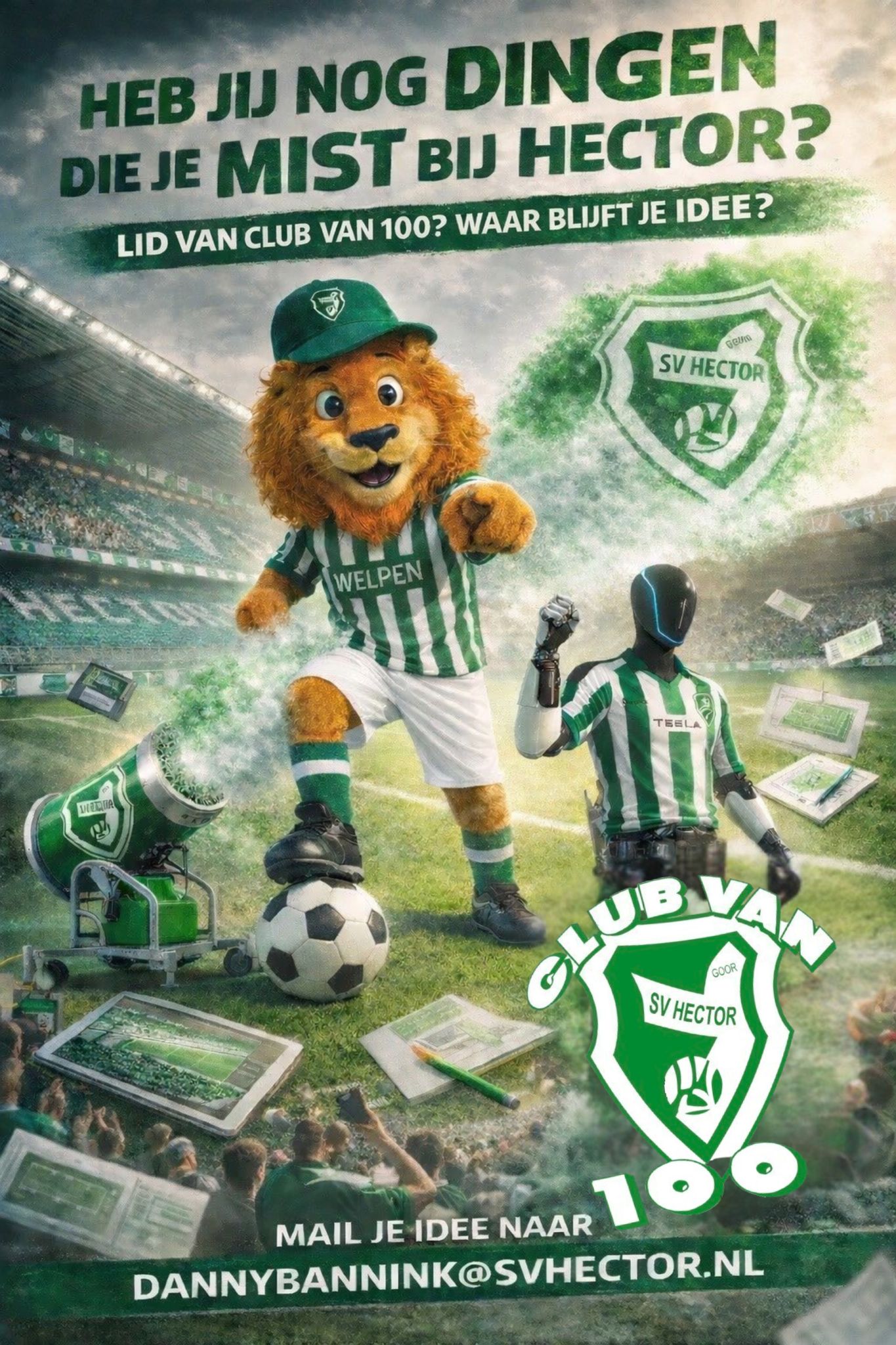 Vrijdag 27 maart is de voorjaarsvergadering van de Club van 100 van Hector. Alle leden dan wel groepen kunnen vanaf nu voorstellen voor besteding indienen bij Danny, Cuno of Benno. Zet een kruis in je agenda voor die vrijdag en kom gezellig naar 't Doesgoor.